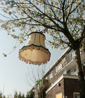Made for the MoDA Outsized show at the Museum of Design and Architecture in London, it is a large old lampshade suspended from a tree branch.